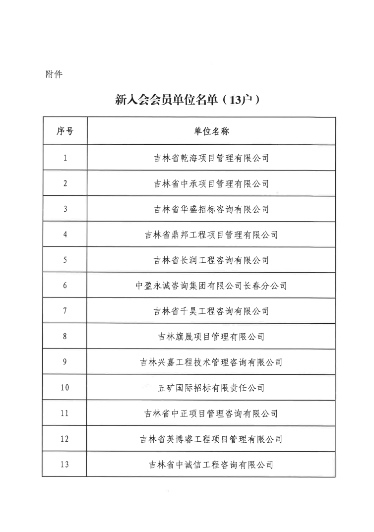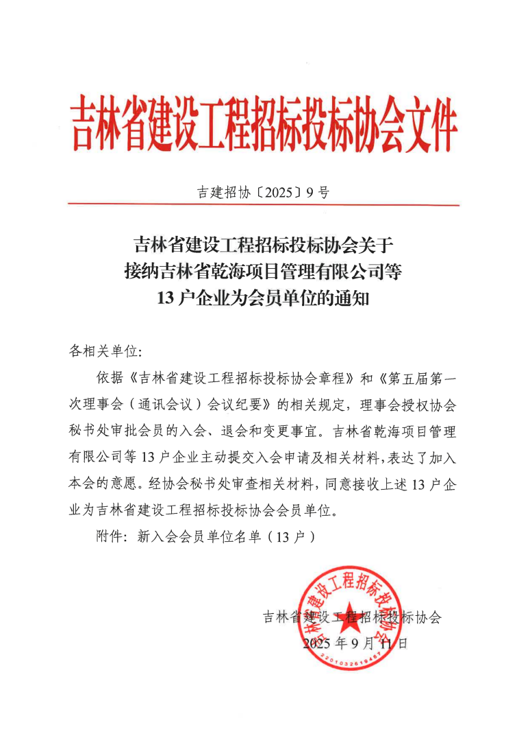 吉林省建设工程招标投标协会关于接纳吉林省乾海项目管理有限公司等13户企业为会员单位的通知