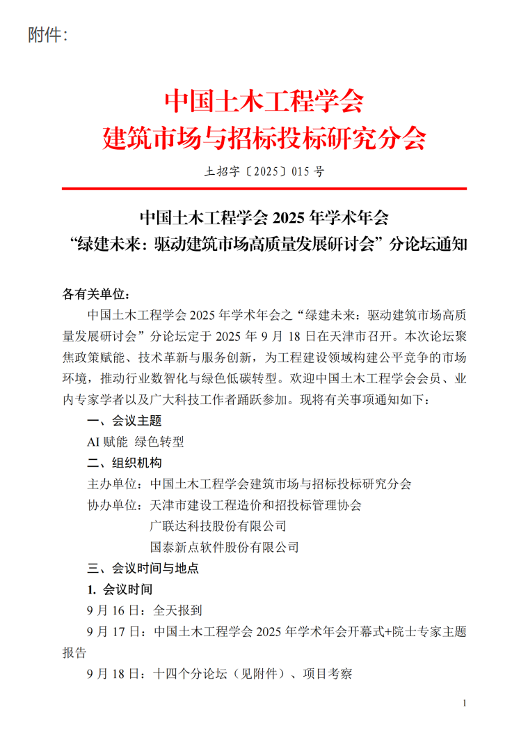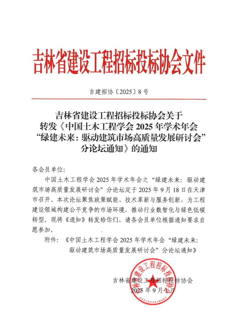 吉林省建设工程招标投标协会关于转发《中国土木工程学会2025年学术年会“绿建未来:驱动建筑市场高质量发展研讨会”分论坛通知》的通知